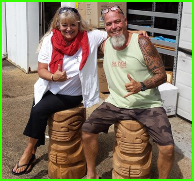 | Jill Marie with Tiki Carver Bill Collins of Kauai (Tiki Stools in Kitchen) Finished product in my kitchen. Very inspirational while mixing tropical concoctions. |