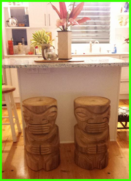 | Jill Marie with Tiki Carver Bill Collins of Kauai (Tiki Stools in Kitchen) Finished product in my kitchen. Very inspirational while mixing tropical concoctions. |